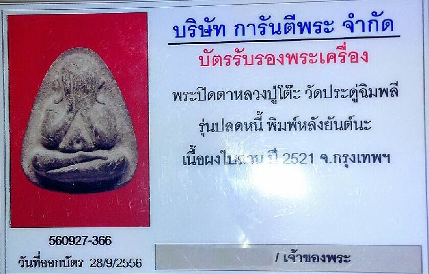 | รายละเอียดพระเครื่อง : | พระปิดตาปลดหนี้ หลังยันต์นะ หลวงปู่โต๊ะ วัดประดู่ฉิมพลีเนื้อใบลาน+หนา+กล่องเดิม มีบัตรรับรองพระแท้ องค์พระหนามาก |